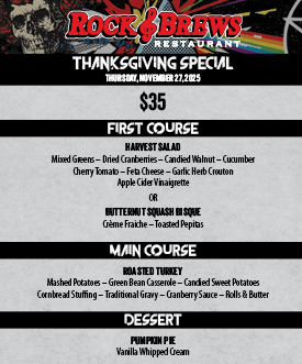 Let Rock & Brews do the cooking this Thanksigivng. Enjoy this three course meal with all of the traditional Thanksgiving favorites for $35.